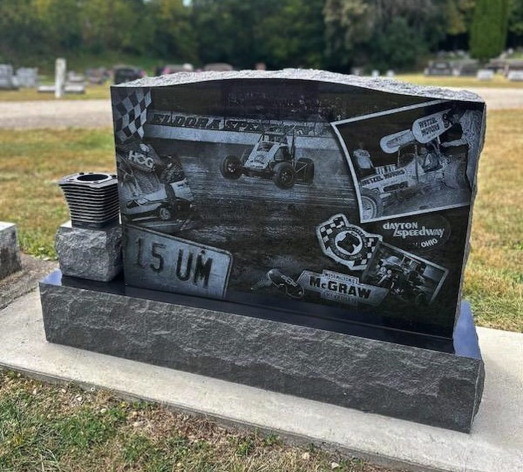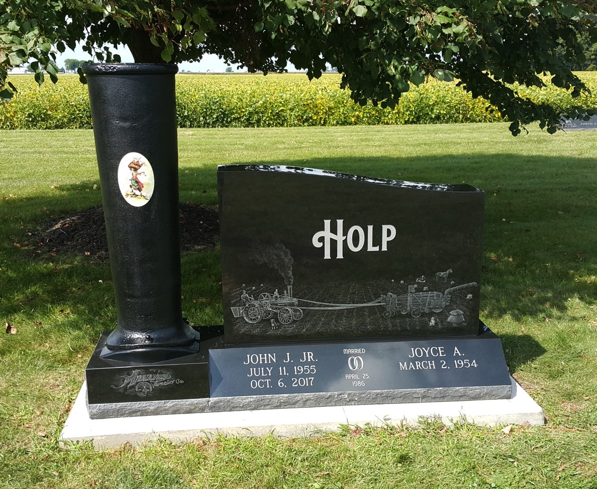 JOHN HOLP was born into a steam engine family from Brookville, Ohio. He got his first steam engine when he was four years old. Later in life he became one of the leading resources for steam engine knowledge. For his monument, we designed a stone that included a smokestack from one of his steam engines.