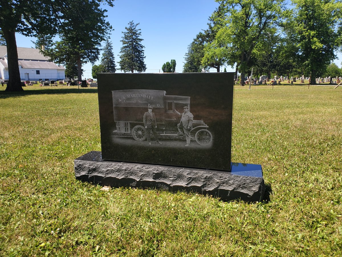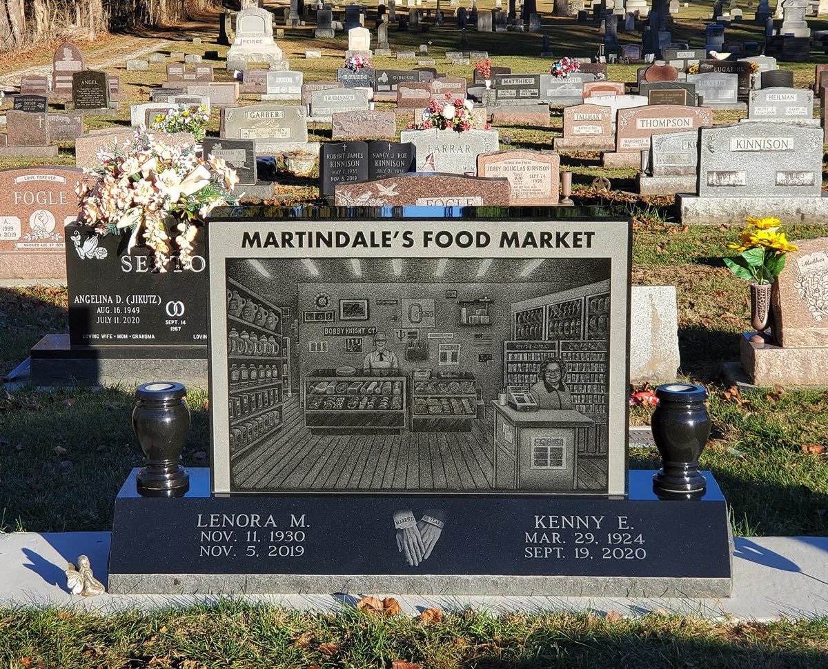 KENNY & LENORA MARTINDALE were married for 68 years. The majority of that time they spent working together in their food market. The store operated from the early 1920s to 2005. They passed within a year of each other, and we had the honor of making their monument. Their food market was an icon in West Milton, so we decided to recreate it. We hand-etched a scene that anyone walking in the front door of the store would have seen when the place was open—Kenny behind the meat counter and Lenora at the cash register. The majority of the town is acquainted with this scene. They happened to have an amazingly good picture of Kenny’s father and grandfather (who started the business), so we laser-etched it on the back of the stone.